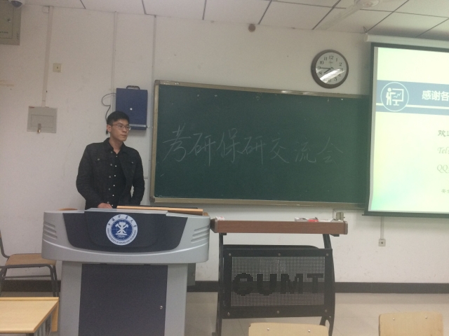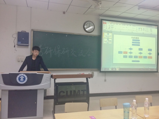 晚七点,会议正式开始。首先,主持人做了简要的开场白并介绍了到场的嘉宾以及讲座的流程。此次会议邀请了大四四位优秀学长学姐来介绍经验,分别是房龄航、谭佳昕、张宏民、张一真,他们四位现已保研或考研至优秀大学。四位优秀学长学姐分别就考研保研的流程及注意事项做了讲解,针对保研考研的具体事项,他们给出了自己的建议。其中,张宏民学长着重介绍了保研的程序、怎样判断自己是否有保研资格、怎样了解目标院校保研政策、怎样了解目标院校及培养方案及师资力量、初试报名和参加复试等问题,并建议学弟学妹有自己明确的追求、对意向院校多加了解、与同学互帮互助等。在简单的介绍后进入交流时间,大三学子们就自己存在的问题提出了疑问,学长学姐们耐心的解答并给出了自己的建议,同学们获益匪浅。