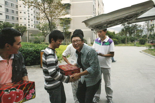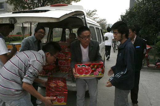 9月29日下午四点半,包子漫画 学生会部分学生会干部在梅三楼下向全院各班发放由学院办公室统一采购的整箱新鲜的“红富士”苹果。各班班长、团支书带领本班同学陆续前来领取。学生会学生干部热情地将每一箱苹果送给各班,并通过班干向各班同学表示良好的节日祝福。