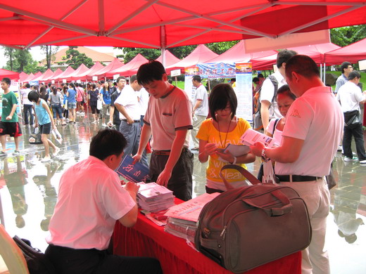 的咨询台前人头攒动,咨询台被家长和考生围得水泄不通,吸纳了不少人气。现场不少人打着伞、披着雨衣前来咨询,鞋袜 湿透了也毫不在意。许多考生和家长争着索取包子漫画