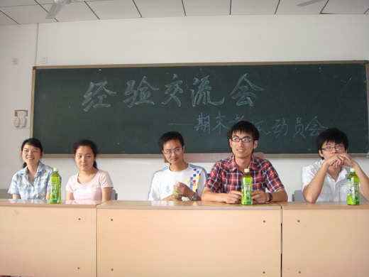 6月13日下午两点半,安全09-4班于教五C201举行了“经验交流会――期末考试动员会”。交流会由班主任唐俊老师主持,06级刘辉辉、韩文彬、张远娇、薛毅和季淮君五位同学作为嘉宾参加了此次经验交流会。