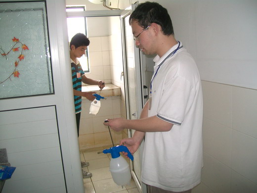 本次消毒活动使用的是党员工作站统一购进的84消毒液,消毒范围主要是室内地面、阳台、卫生间及阳台的卫生死角。消毒过程中,工作人员尽量满足一些同学对宿舍其它地方进行消毒的要求。他们还对消毒水的功能作用及其负面影响等向同学们作了介绍,并且提醒大家收好自己的生活用品以免受到消毒水的污染以及消毒后注意通风等事项,他们认真负责的态度受到了大家的赞赏。