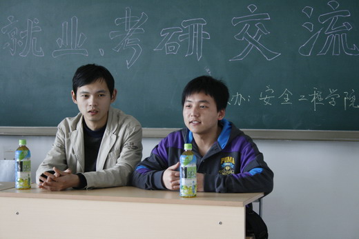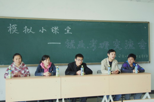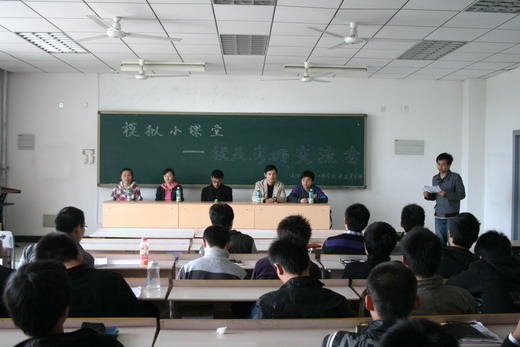 团委、学生会科技学术部主办的“模拟小课堂――就业、考研交流会”在教五C302顺利举行。本次交流会邀请到了06级的史波波、江大鹏、韩文彬、张远娇和王洁同学作为嘉宾,为大家解答就业、保研、考研方面的疑问。