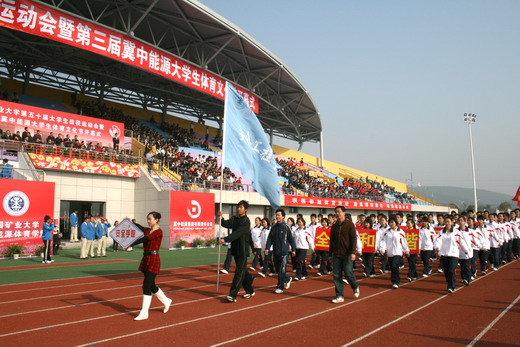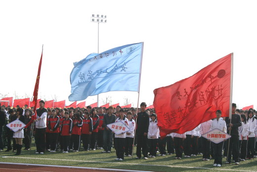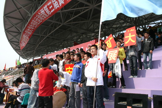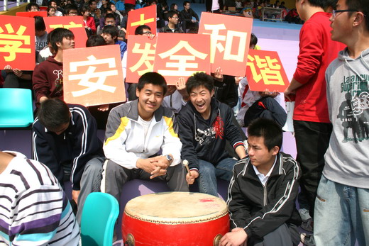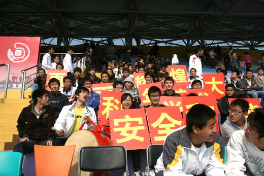 看台上的观众遵守秩序,为运动员们摇旗呐喊,加油助威,充分展示出安全学子精诚团结、积极向上的风采。