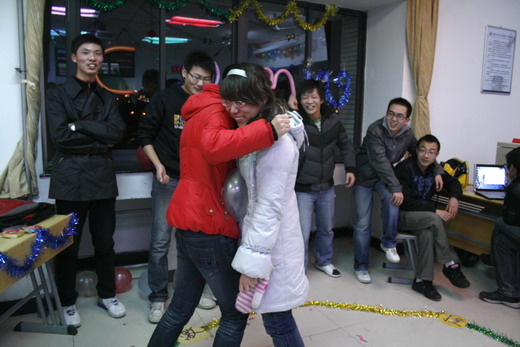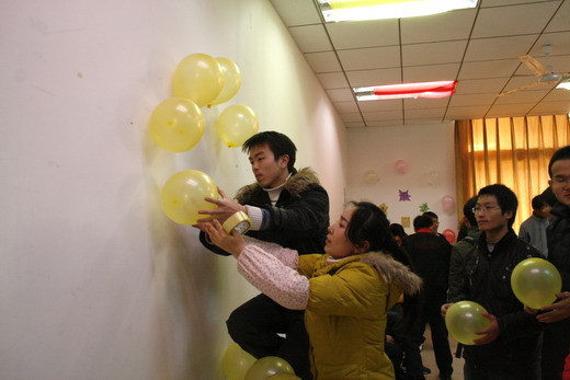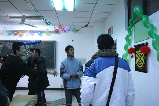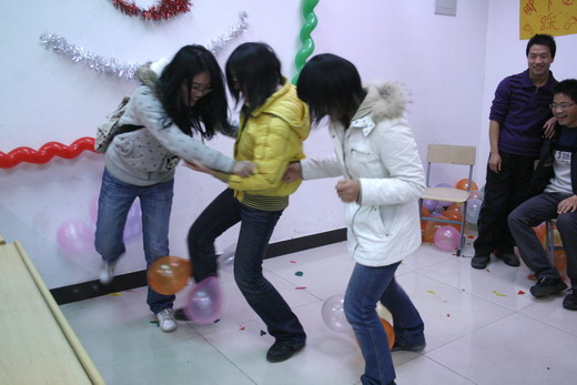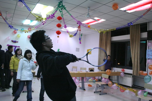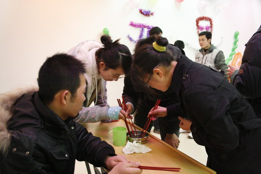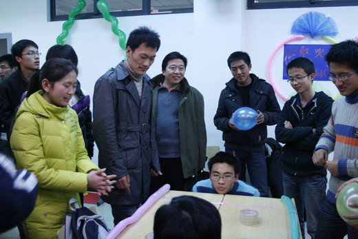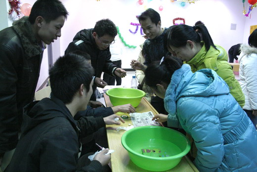 在元旦游艺宫中筹备了“脚下出‘踩’”、“水上浮针”、“一拍定天下”、“极速运球”等等一系列的游戏。“水上浮针”要求同学利用水的表面张力将针浮在水面上,但不幸的是,好多同学的针刚接触到水面就下沉了;“极速运球”需要同学们用筷子夹着乒乓球把它放到另一端的杯子里,虽然难度有点高,仍有很多同学顺利过关,荣获奖券;“一拍定天下”则要求用网球拍正反面反复击拍乒乓球……同学在玩游戏的过程中,相互鼓励,组织者也不时说些幽默的话语逗得大家开怀大笑。教室里大家的欢声笑语融成一片,彰显出元旦的轻松欢乐气氛。