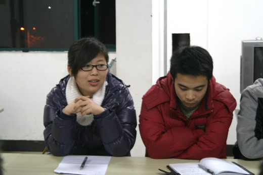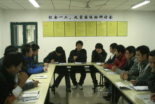 会议于九点十五分正式开始。伏旭首先向在座各位简单介绍了一二・九运动的背景、过程和重要意义,鼓励大家积极发掘其深层次意义,努力向前辈们学习可贵的爱国精神。他分别从爱国运动和青年责任两个方面进行阐述,讲解了自己对一二・九运动的认识。他引用了奥运火炬传递期间徐州出现的抵制家乐福等事件,指出大学生应当理性爱国,并提出“三思而后行”、“以国家利益为重”、“丰富自己技能,实现个人价值”和“心怀感恩”四点要求。接下来,与会人员纷纷积极发表各自的看法,结合学院发展现状、学生学习状态和学生 会发展问题,指出了一二・九运动的现实意义,力争在全院形成弘扬爱国精神的良好风气。