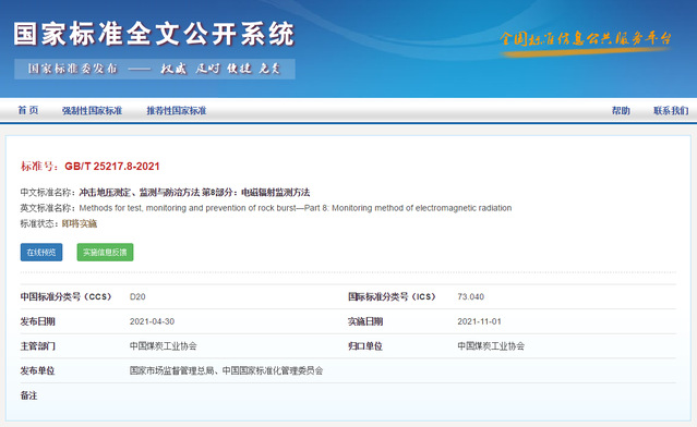 王恩元教授、何学秋教授、刘晓斐教授等牵头,联合辽宁工程技术大学、徐州福安科技有限公司、河南大有能源股份有限公司、抚顺矿业集团有限责任公司等多家单位专家制定的1项国家标准正式获批,标准《冲击地压测定、监测与防治方法第8部分:电磁辐射监测方法》编号为:GB/T 25217.8-2021,且将于2021年11月1日起实施。