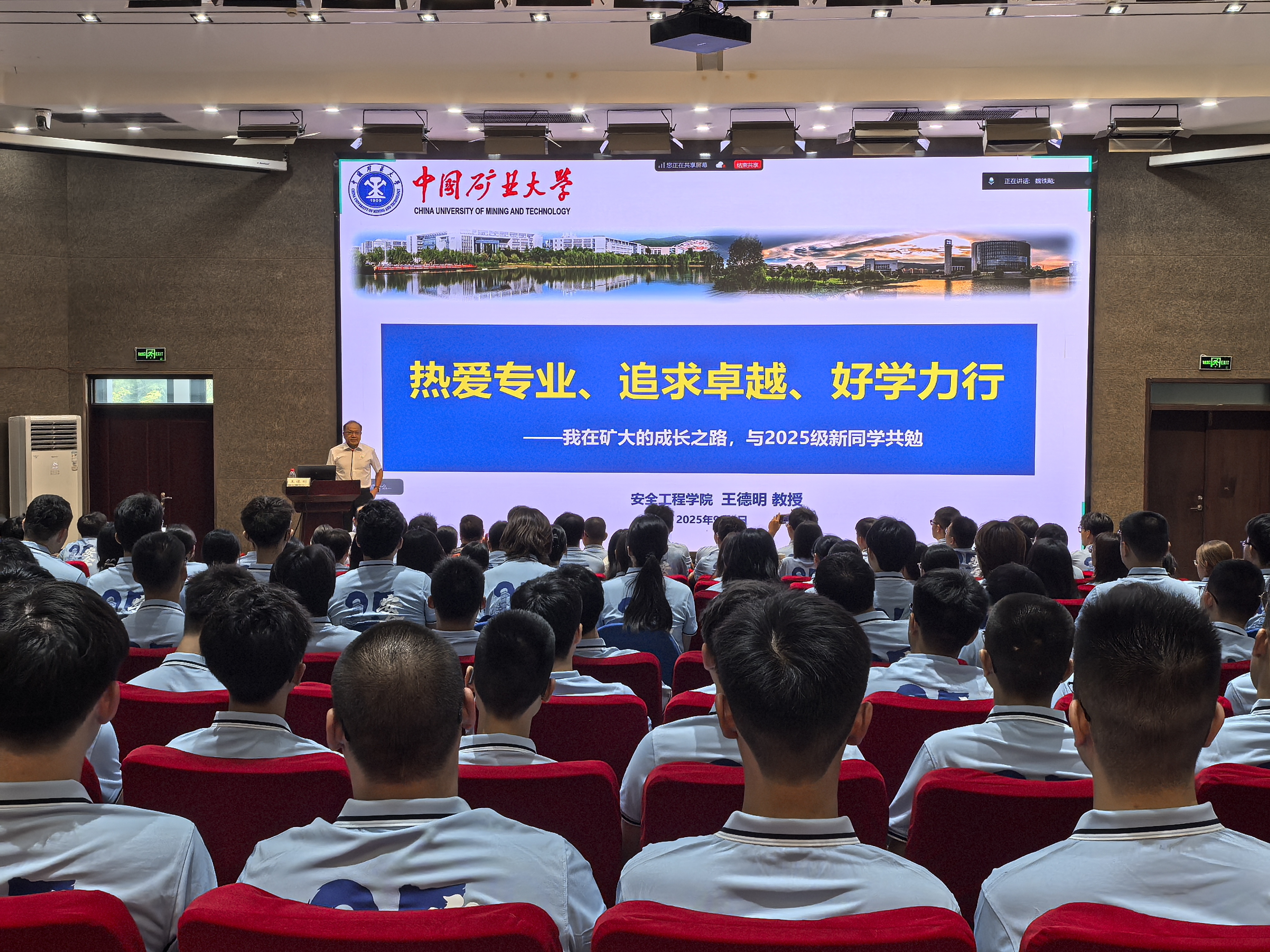 王德明教授深情回顾了他在矿大数十载的学习、科研与育人历程。他以自身从普通学生成长为学科带头人的奋斗足迹为鲜活案例,生动诠释了“热爱”作为专业学习的原动力、“卓越”作为事业发展的追求、“好学力行”作为矿大人精神特质的深刻内涵。他分享的那些克服困难、潜心钻研的生动故事,以及将个人理想融入学科发展和国家需求的赤子之心,为初入大学校园的学子们点亮了前行的明灯。王德明教授强调,安全学科肩负着守护人民生命财产安全和国家能源资源事业发展的重大使命,投身于此不仅需要扎实的知识技能,更需要强烈的社会责任感和家国情怀。他鼓励2025级新同学珍惜大学时光,勇于探索未知,敢于挑战难题,在矿大这片沃土上脚踏实地、砥砺前行,努力成长为可堪大用、能担重任的安全领域栋梁之材。