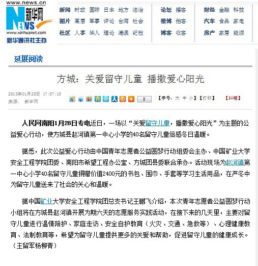 的10级学生王鹏飞作为中国青年志愿者公益圆梦行动A23项“关爱留守儿童,播洒爱心阳光”项目的负责人,凭借其在“反哺家乡,回报社会”公益活动中的突出表现,荣获本届“青春矿大校园年度人物”称号。