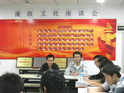 党员工作站召集09级、10级全体学生党员在梅三五楼党员工作站召开廉政文化座谈会。10级辅导员李成刚老师出席会议并作会议总结,本次会议由党员工作站副站长刁望鲁主持。