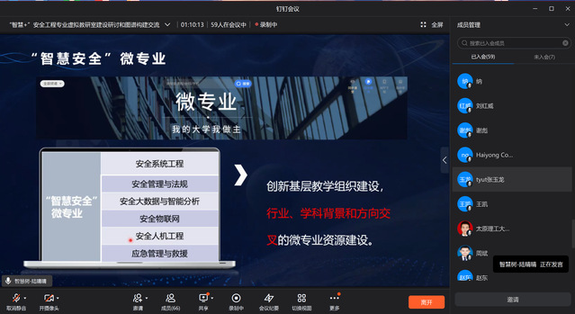 2022年4月29日,教育部“安全工程专业虚拟教研室”系列教研活动在教研室钉钉平台以线上形式开展,本次教研活动邀请智慧树网金课咨询师陆晴晴老师做了安全学科知识图谱--“人工智能+微专业”专题报告,与会人员就安全工程学科知识图谱构建和微专业建设进行了研讨。本次教研交流活动共有来自虚拟教研室共建单位的11所高校的82位老师参加,会议由虚拟教研室联络员、建设秘书裴晓东主持。