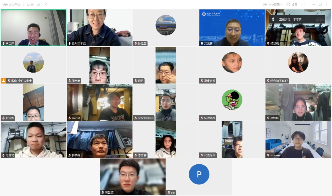 优秀毕业生、徐州市应急管理局的李鑫校友作为主讲嘉宾。会议由安全监测与应急管理研究所所长李忠辉教授主持。