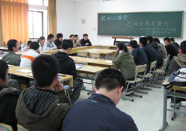 首先大家认真学习了两会的主要内容和一些热点问题;接着又针对当前的热点问题同学们互相展开讨论,发表了自己的想法;接着本次研讨会进入了高潮——主题辩论会。班级同学按宿舍划分为四组,分别就“是否应该取消文理分科”和“是否应该取消五一长假”的问题进行了辩论,大家表现出极高的参与热情,纷纷发表自己的看法。同学们诙谐幽默的语言,严谨的分析逻辑,赢得了在场观众的阵阵掌声。