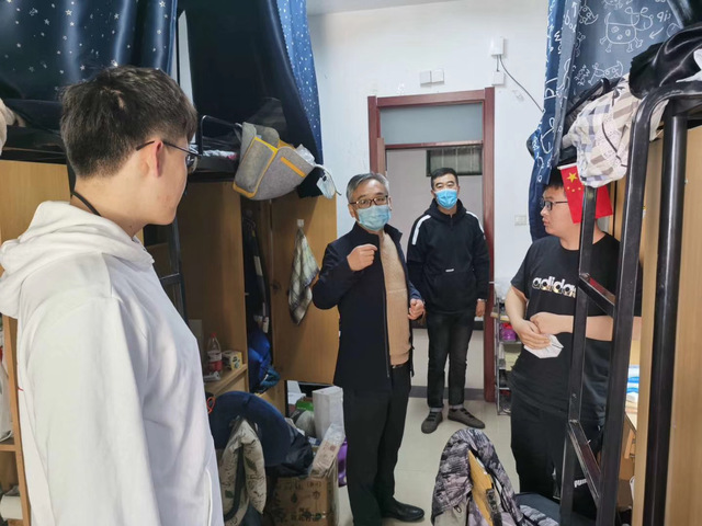 在学生宿舍,朱晓东副院长详细了解了学生出入体温检测和消毒杀菌等疫情防控举措,询问目前存在的问题,并就人流密集时段疫情防控的薄弱环节提出整改要求。王亮副院长询问了同学们居家线上学习的感受和效果,了解同学们的意见建议,回答了同学们关心的返校后一段时间内课程学习的相关问题。