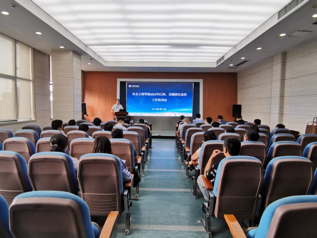 在矿业科学中心A200举办2021年江西、无锡招生宣传工作培训会。学生工作处处长冯震作招生宣传政策解读和工作培训。院长王恩元、校工会副主席郭鹏、行政副院长郭梅香、副院长王亮及参与江西、无锡目标中学招生宣传工作的老师出席工作培训会。院党委副书记孙留涛主持会议。