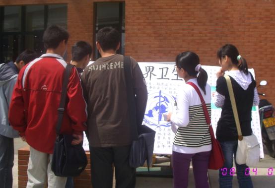 生活部成员向同学们发放了以健康为主题的传单,并积极向同学们讲解健康知识。活动现场以 “保护健康不受气候变化的危害”为主题的展板也吸引了很多同学驻足观看。同学们还积极提出了一些关于生活健康知识、世界健康日的宗旨等各方面的问题,生活部成员都给予了详细的解答。