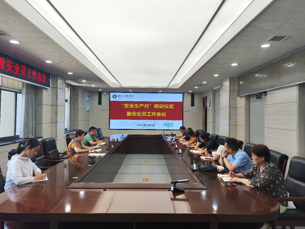 在矿业科学中心A412召开2024年“安全生产月”启动仪式暨安全员工作会议。副院长郭梅香,煤矿灾害防控全国重点实验室、煤矿瓦斯治理国家工程研究中心行政副主任胡惠强,实验中心全体人员以及学院安全员参加了会议。会议由副院长郭梅香主持。