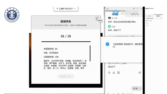 李增华教授通过腾讯课堂直博形式,开展线上教学,主讲《火灾事故调查》。通过平台工具签到,选课的38人全部进入平台课堂。