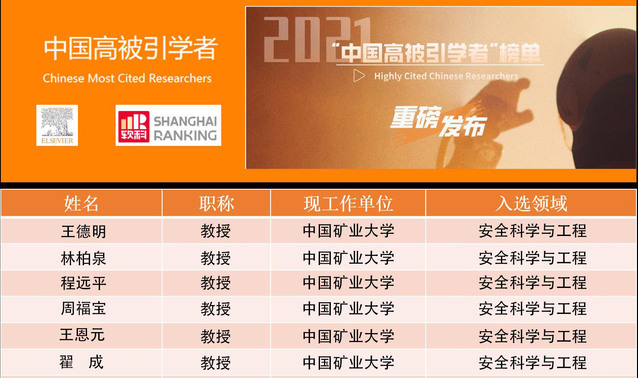 王德明、林柏泉、程远平、周福宝、王恩元、翟成等6位教授入选2021“中国高被引学者”。