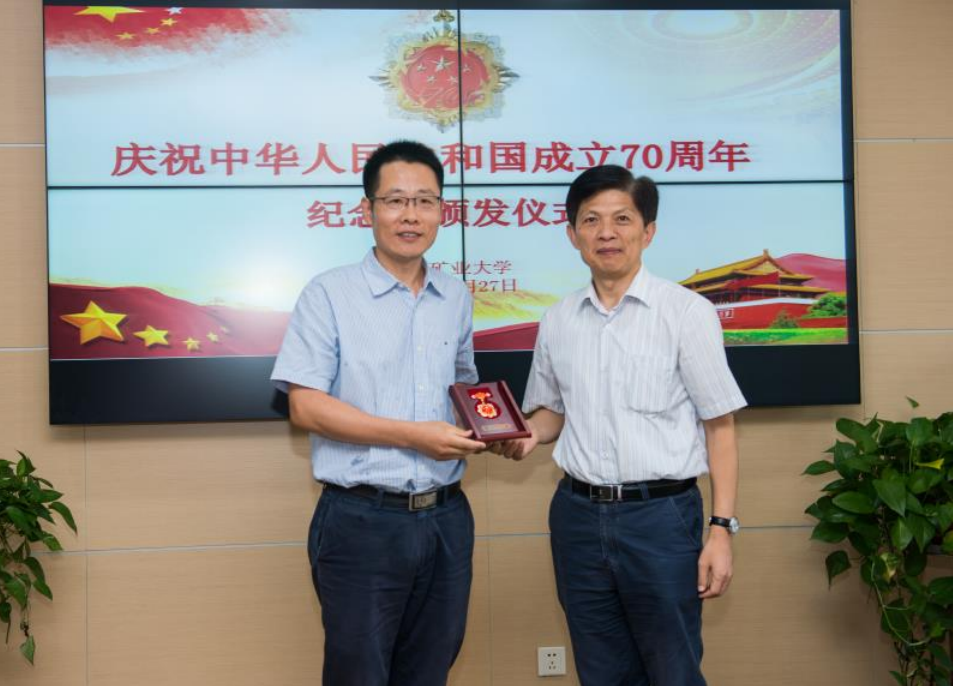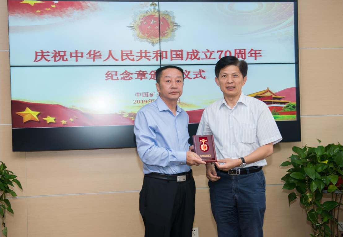 周世宁、王德明、林柏泉、程远平、王恩元、周福宝、秦波涛、翟成等8位教授获得了由中共中央、国务院、中央军委联合颁发的“庆祝中华人民共和国成立70周年纪念章”。宋学锋校长分别为在校的周世宁院士、林柏泉教授、程远平教授和翟成教授发放了纪念章。