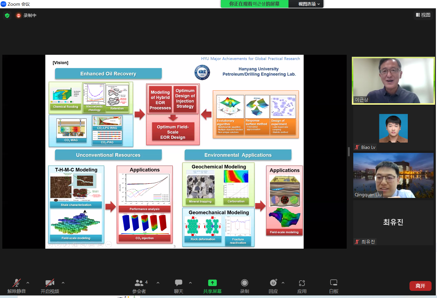 Kun Sang Lee教授简要介绍了汉阳大学与地球资源与环境工程学院的发展历史,重点介绍了自己的三个研究方向“Enhanced Oil Recovery” “Unconventional Resources”及“Environmental Applications: CCS, UTES”,分享了团队前期在油藏CO2驱油提高采收率、CO2致裂页岩等方面的研究成果,并诚挚邀请刘清泉副教授及团队成员来汉阳大学访问交流。