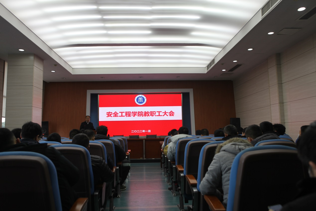 王恩元院长向全体与会人员报告了2021年度学院工作,他全面回顾和总结了一年来学院本科教学、人才培养、师资队伍、科学研究、学科建设、平台建设、党建和管理与服务等方面取得的成绩,并就2022年的工作提出了建议。王恩元院长强调,2021年是非同寻常的一年,在校党委及行政的正确领导下,全院师生同心协力、抗击疫情,扎实有序并高质高效地完成了各项任务,学院事业发展取得了新进展、新成效。但是在双一流同期总结和第五轮学科评估过程中,发现工作中仍存在的一些问题,学院将作为重点任务在“十四五”期间重点整改。