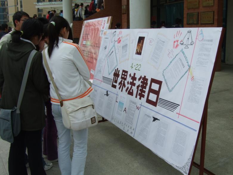 活动现场,在向同学们分发宣传法律知识传单的同时,宣传板吸引了许多同学的驻足观看。宣传板报以世界法律日作为主题,以大学生在求职过程中遇到的陷阱和毕业生在试用期期间遇到的侵权现象作为案例,向同学们讲述了如何利用法律武器主动保护自己的合法权益。重点从实习生与实习单位的关系、实习期间的报酬、实习过程中意外伤害的处理等方面讲解了如何保护大学生实习期间的合法权益。展板还对现在大学校园里普遍存在的传销组织和常见的大学生校园犯罪等现象结合案例作了分析,让大家对与自己日常生活息息相关的法律知识有了充分的了解。