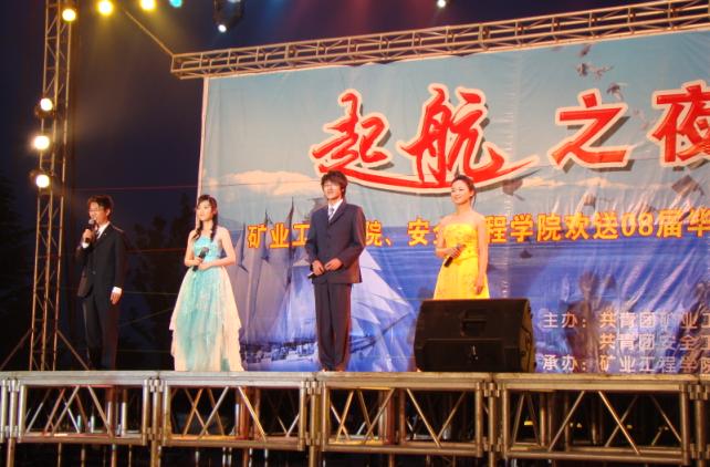 学生会承办的“启航之夜”毕业生晚会在南湖校区二餐厅广场隆重举行。校党委宣传部副部长刘静丽、校精神文明办公室副主任李广文、学生工作处副处长蒋敏老师、校团委书记熊志忠老师、矿业学院党委书记姬长生老师、包子漫画