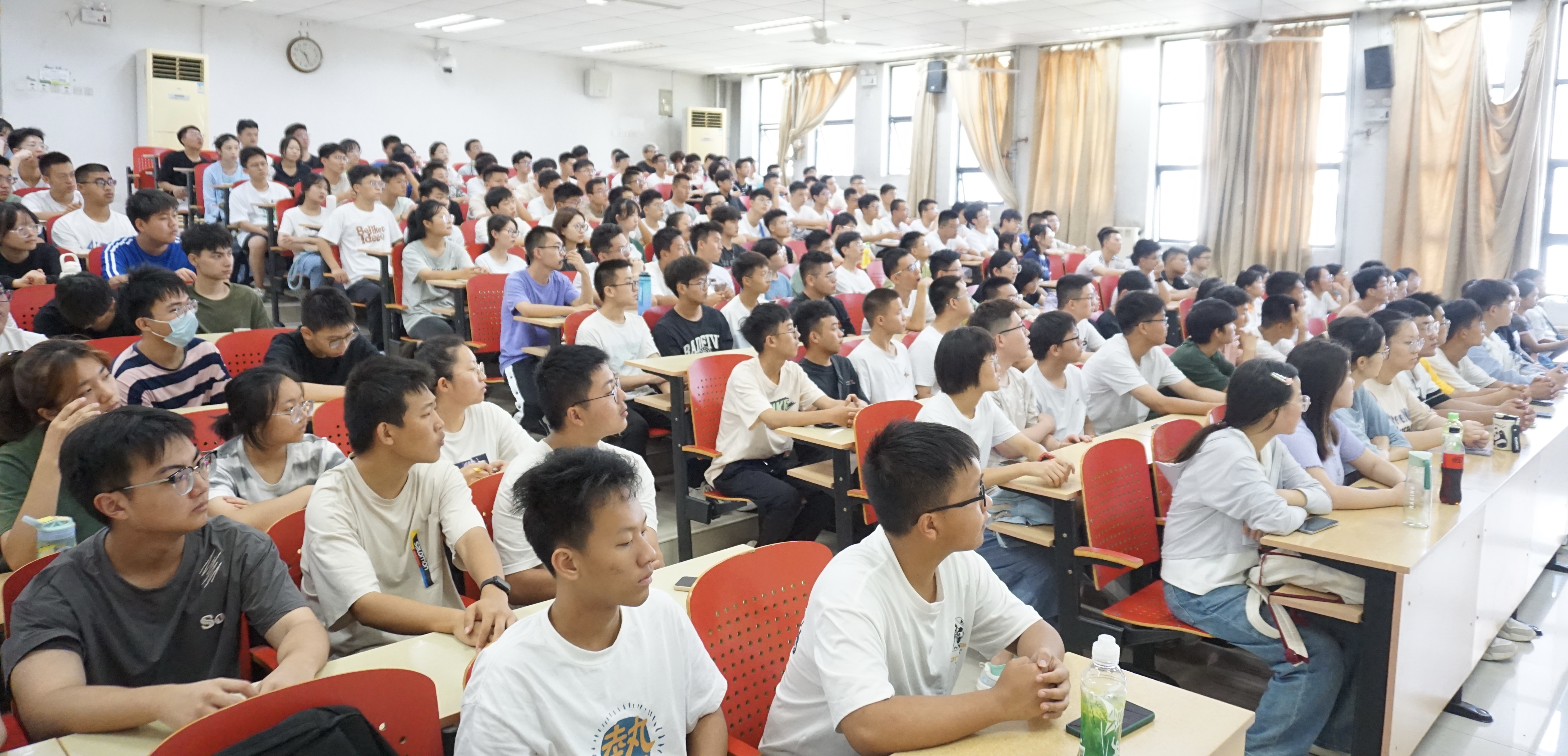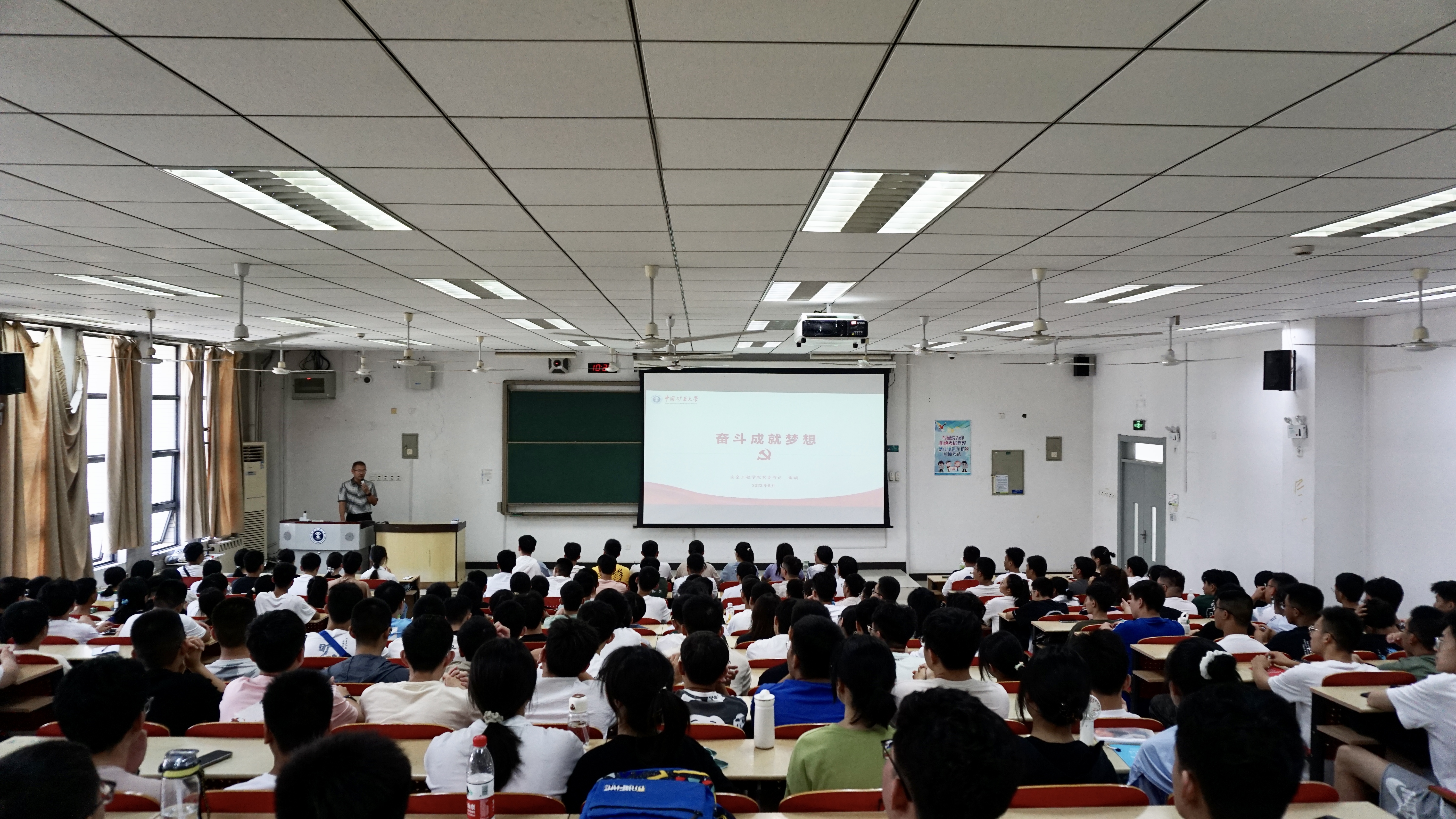 ”“谈大学生活”“谈当代青年大学生”四个方面向2023级本科生系统讲述了作为一名矿大青年学子需要肩负的责任和使命。首先,他用时间轴的形式向新生展示了矿大百年发展史和奋斗史,激发学生爱校荣校的热情。其次,他用真实数据和图表比对等形式直观的向同学们介绍了学院的具体情况,使同学们对学院的学科实力、师资力量和发展方向都有了初步了解。接着,他从专业学习、生涯规划、社会工作等方面对同学们提出了很多中肯的建议。随后,他号召同学们要争做“有理想、敢担当、能吃苦、肯奋斗”的新时代青年,同时他结合当今国际形势,用真实的事例激励青年学子在大学阶段为强国学习,以科技报国。