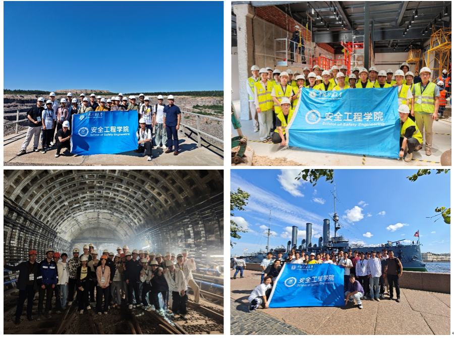 校外实践将课堂延伸至现场工程一线。在“Gavrilovskoye”露天矿山,同学们了解了露天矿山开采过程中常见的矿山灾害事故及预防措施;在圣彼得堡矿山救助站,专业救援人员展示了先进的应急救援装备,并系统讲解了矿山典型事故的应急响应流程与团队协作要点;在“Smart Labor”安全作业防护培训中心,通过实体搭建的土木施工高风险场景模拟平台,同学们直观地学习了施工现场常见危险源(人、机、料、法、环)的科学识别、风险评估、有效预防与规范处置方法;在在建地铁站施工现场,同学们详细考察了地下工程建设过程中的安全监测预警、深埋长隧道通风与消防等关键施工安全技术与管控要点。此外,为进一步促进双方的跨国文化理解与交流,圣彼得堡矿业大学利用周末时间精心组织了丰富的“City Tour”文化探索活动,同学们近距离参观了曾打响“十月革命一声炮响”的阿芙乐尔号巡洋舰,深刻感受了俄罗斯历史文化。