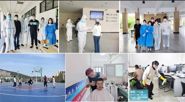 疫情当下,互帮互助,共克时艰。学生党员刘梦凯、黄一鸣、张国富、杨威等,作为志愿者积极参与到学校的疫情防控工作中;2021级硕士研究生花春雨为在校值守的后勤人员捐赠被褥;2019级学生叶子清,2020级学生张凇嘉,主动在梅三宿舍楼义务为同学们理发。2021级学生聂晓阳说,疫情下的校园,因为有了身边同学的陪伴,显得格外让人温馨。