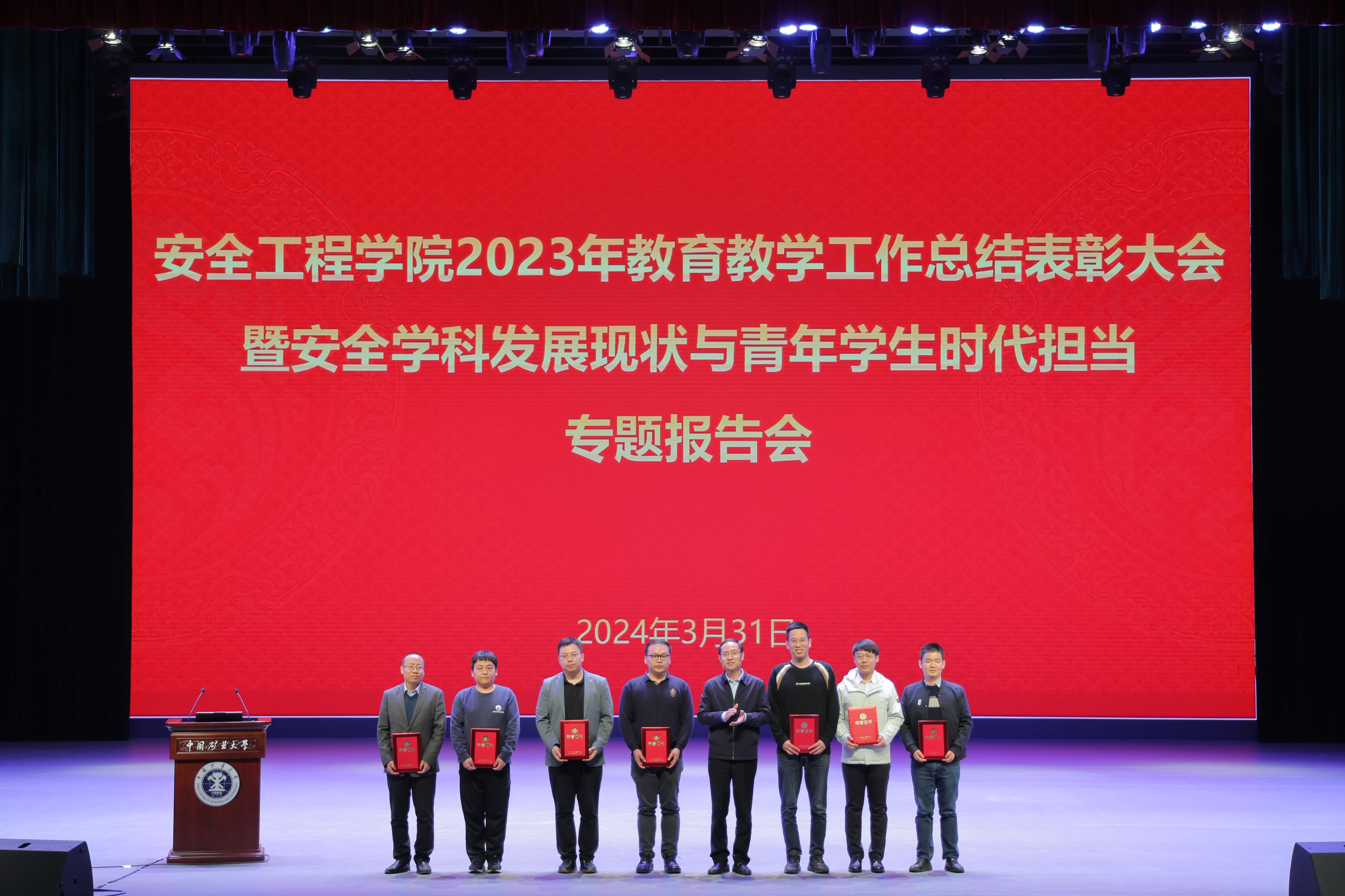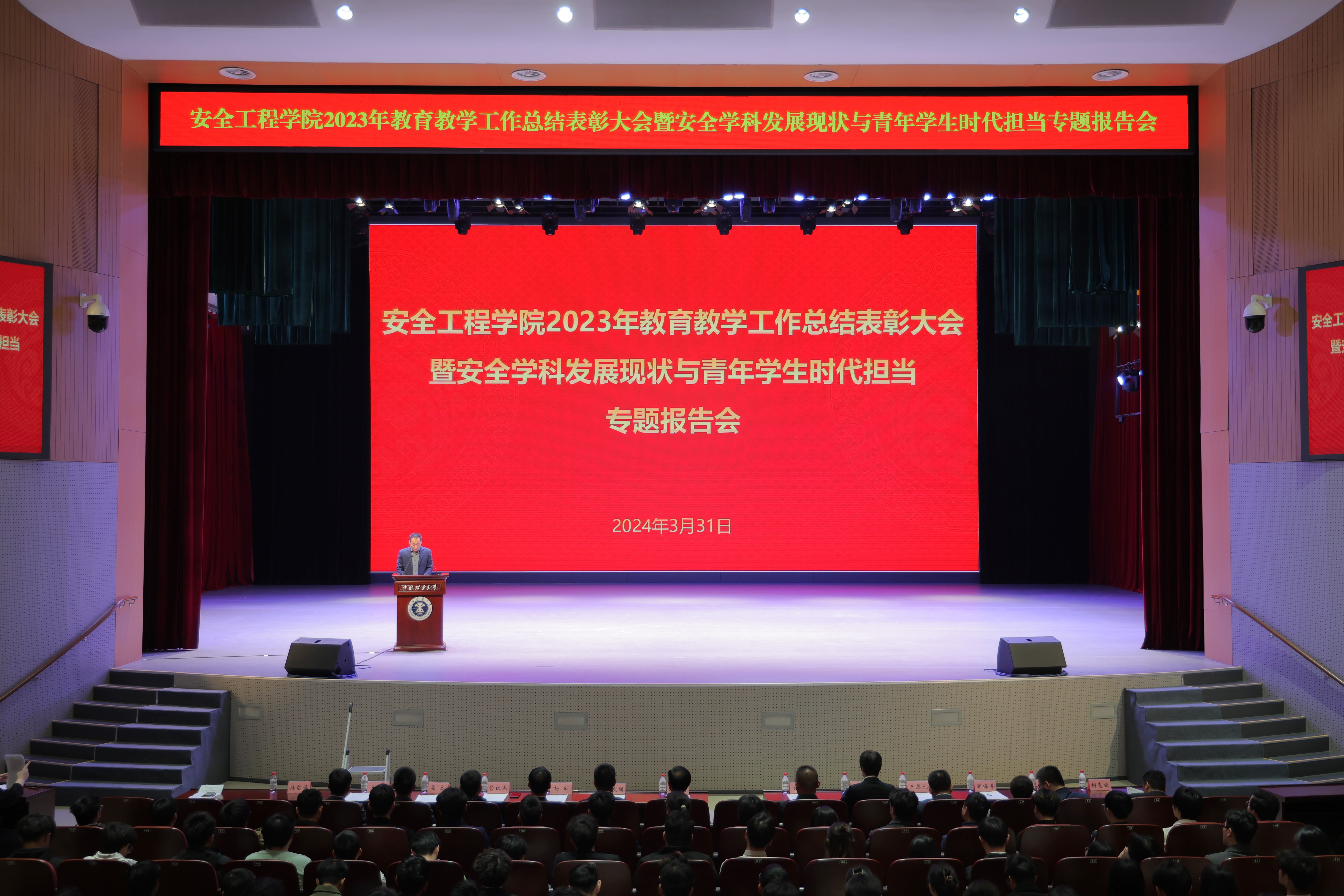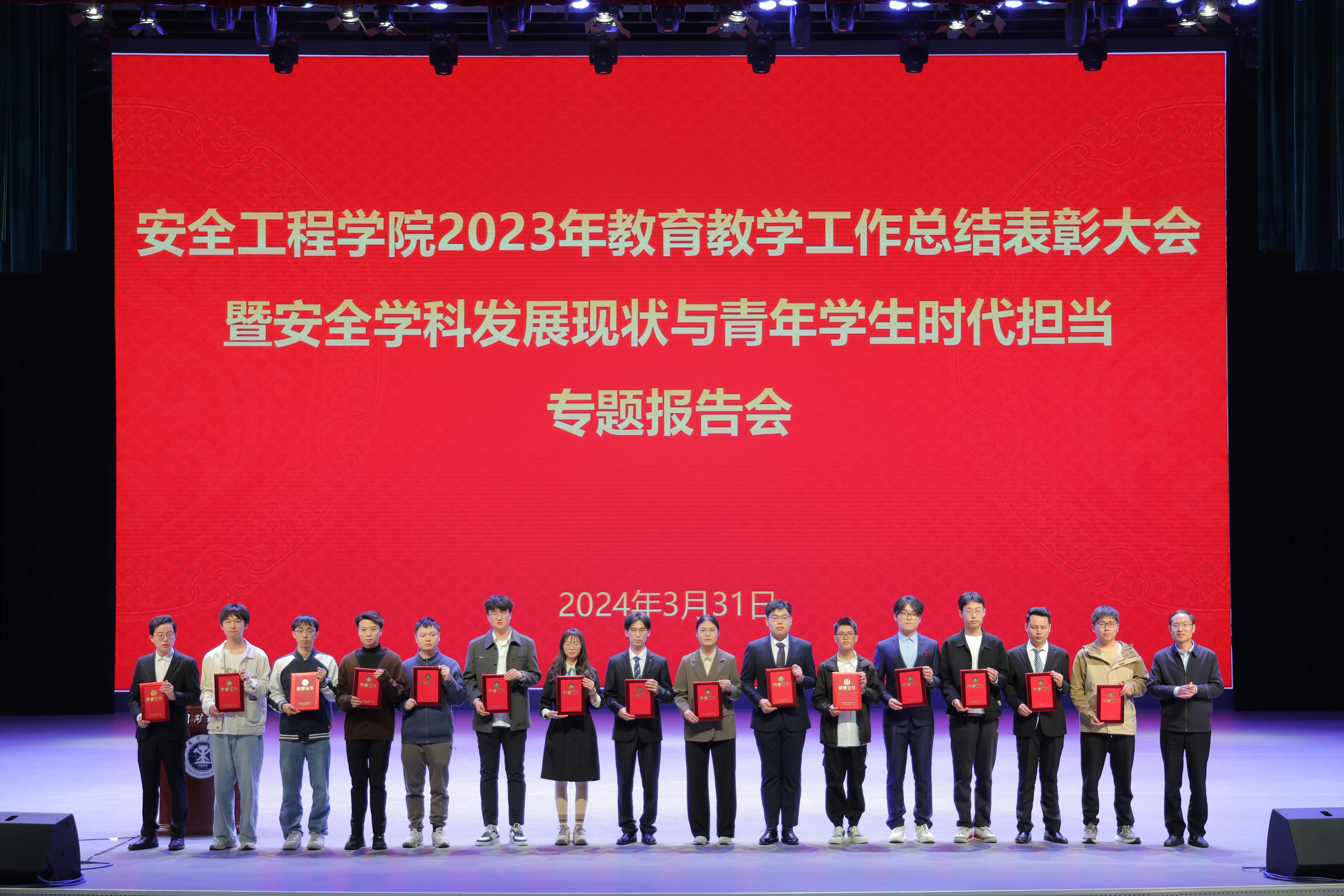 3月31日下午,学院在明德礼堂召开2023年教育教学工作总结表彰大会暨安全学科发展现状与青年学生时代担当专题报告会,会上对2023年在人才培养过程中的优秀教师,在团学工作、创新创业、评奖评优等方面涌现出的各类先进集体和优秀个人进行表彰。校党委副书记李江涛,校团委书记谢发国,发展规划处处长曲颂,学生工作处副处长杨昭,教务部副部长付豪,研究生院副院长管红杰应邀出席会议,学院全体院领导,研究所所长、中心主任,近3年新进教师,班主任和全体本科生以及部分研究生参加会议。院党委副书记孙留涛主持大会。