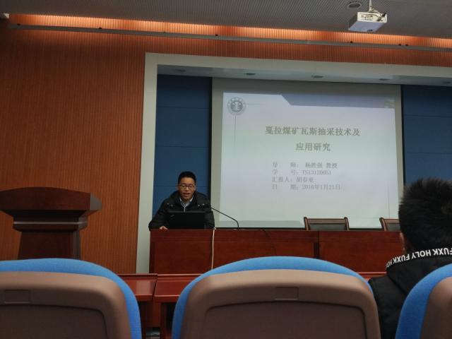 在经过主持人丁振的简短介绍后,来自2013级的研究生胡春亚、李永冲、焦彬、刘宝贝、耿龙建、陶卫勇、王彦恒、杨泉林、张晶晶、顾范君以及张强分别就各自的研究领域做了相关学术报告。首先由李永冲与大家分享他的研究成果,报告题目是“石港煤矿坚硬顶板高瓦斯综放面初采期瓦斯涌出特征及治理关键技术研究”,在他的报告中,以石港煤矿为例,对石港煤矿某综放面瓦斯涌出情况进行了分析,并运用数值模拟的方法提出初采期坚硬顶板综放面瓦斯综合治理技术体系。随后耿龙建向大家讲述了 “平煤十一矿煤与瓦斯突出声电综合预警技术研究”,介绍了声电指标对动力显现的响应等研究内容,认为煤岩破坏会产生电磁辐射和声发射信号,声电信号可以反映煤与瓦斯突出危险变化规律。接下来王彦恒对其报告题目 “基于无线通信的煤层瓦斯压力测定方法及系统研究”进行了介绍,他对新型无线测压仪的测压机理以及所用到的硬件软件部分进行了仔细分析与讲解。此外,胡春亚、焦彬、刘宝贝、陶卫勇、杨泉林、张晶晶、顾范君以及张强等也对自己的研究内容进行了讲解。